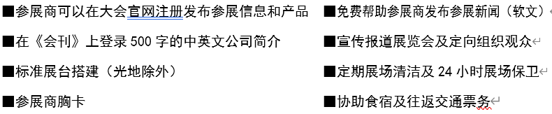 其他廣告費(fèi)用:廣場大牌子:10000元/個(gè)(3*6m);手提袋:30000元/1萬個(gè);門票背面廣告:20000元/4萬張;技術(shù)講座:10000元/每場·45分鐘(含場地及燈光音響、投影儀、講臺座椅、白板、礦泉水等)。?參展程序1.參展單位請?jiān)敿?xì)填寫《參展申請表》,并加蓋公章后傳真或交寄至大會(huì)組委會(huì);2.企業(yè)報(bào)名后7個(gè)工作日內(nèi)將參展費(fèi)用匯入大會(huì)組委會(huì)指定帳號,從而確定展位;3.展位、廣告等由組委會(huì)統(tǒng)一安排,“先申請、先付款、先分配”,協(xié)辦單位可優(yōu)先安排;4.已報(bào)名參展企業(yè)因自原因不能參展,其所繳納費(fèi)用不作返還,所訂展位由主辦方全權(quán)處理;5.服從展會(huì)總體布局,組織單位有權(quán)在必要時(shí)對個(gè)別展臺位置進(jìn)行調(diào)整,因不可抗拒的因素如自然災(zāi)害,政府行為,社會(huì)異常事件等,組織單位可以延遲或取消展會(huì);6.特別提示:所租用展位嚴(yán)禁轉(zhuǎn)租、轉(zhuǎn)售展位;不準(zhǔn)展出假冒侵權(quán)產(chǎn)品,以及在展廳內(nèi)現(xiàn)場零售展品或出售其他商品;一經(jīng)發(fā)現(xiàn)組委會(huì)將取消參展資格,展位費(fèi)用不再退還;不準(zhǔn)在通道上堆放物品。? 免費(fèi)增值服務(wù)