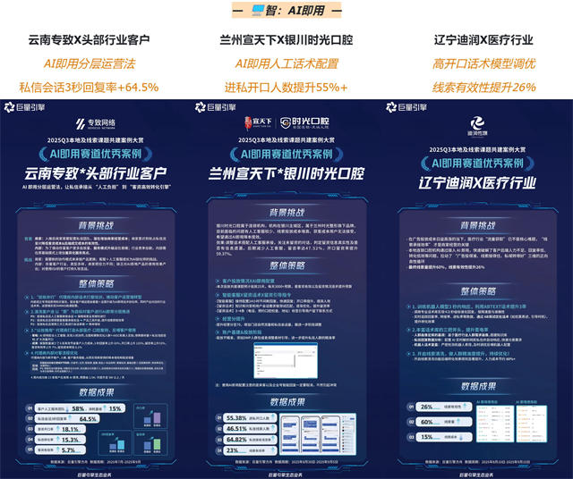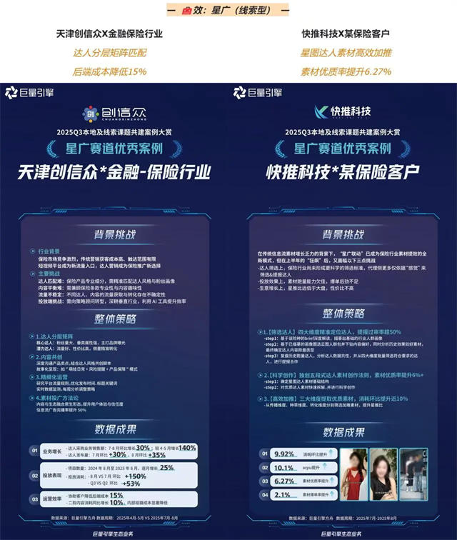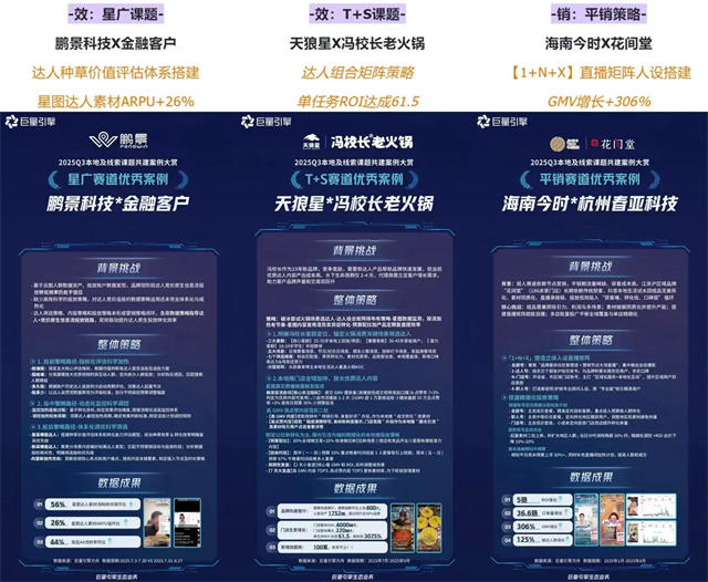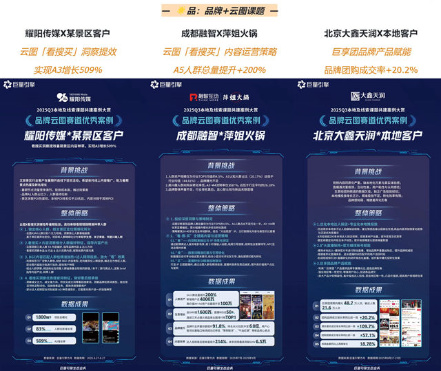 巨量引擎2025Q3本地&線索業(yè)務(wù)場(chǎng)景課題共建,根據(jù)年度策略導(dǎo)向設(shè)置了「品」、「效-T+S & 星廣」、「銷」和「智」四大專題 & 五大課題,公開招募共105家代理進(jìn)行了課題報(bào)名,最終遴選45家代理入圍進(jìn)行課題共建,本期共產(chǎn)出了36則有效案例。為保障公平性原則,本次課題共建案例評(píng)選采用交叉評(píng)分,綜合評(píng)估投放策略、產(chǎn)品應(yīng)用、生意效果和行業(yè)方法,最終評(píng)選出積分榜top3及15則優(yōu)秀案例。