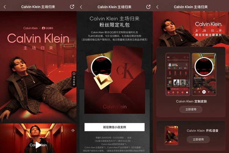 本次活動包含Calvin Klein定制開機語音閃屏、Calvin Klein定制皮膚裝扮等主題限定裝扮,以及「Calvin Klein主場歸來」限量粉絲禮包。其中最引人注目的“可轉贈”機制,正悄然改變音樂平臺粉絲經濟的運營邏輯。而選擇CK作為聯合發(fā)起方,則是本次合作能夠迅速“擊穿”粉絲圈層,并產生廣泛回響的關鍵戰(zhàn)略布局。