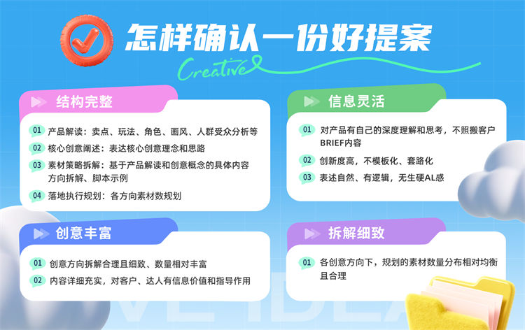 服務商提案的質量,是后續(xù)素材高質量交付的關鍵前置保障,其評估需聚焦 “結構完整、信息靈活、創(chuàng)意豐富、拆解細致” 四大核心標準。