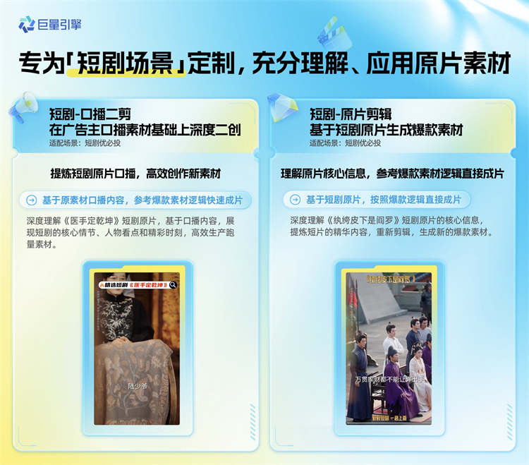 當(dāng)前,短劇營(yíng)銷火熱,正成為品牌搶占用戶心智的關(guān)鍵。在短劇場(chǎng)景下,如何高效產(chǎn)出優(yōu)質(zhì)素材?「短劇-口播二剪」精準(zhǔn)提煉原素材的口播內(nèi)容亮點(diǎn),深度理解原片,契合爆款邏輯生成新的視頻,助力廣告主達(dá)成更優(yōu)營(yíng)銷效果。無(wú)需依賴復(fù)雜剪輯,「短劇-原片剪輯」會(huì)基于短劇原片的核心信息,按爆款素材邏輯,直接生成高質(zhì)量視頻素材,省時(shí)省力,助推廣告主在短劇賽道快速布局、搶占流量。