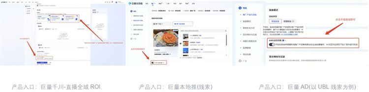 如何開啟「AIGC 動(dòng)態(tài)創(chuàng)意」功能?只需打開巨量千川、巨量AD、本地推投放平臺(tái),按照產(chǎn)品手冊(cè)上的操作指引,找到「AIGC 動(dòng)態(tài)創(chuàng)意」開關(guān),一鍵開啟,即可自動(dòng)完成 “素材衍生→廣告投放” 全流程。開啟后,同一抖音號(hào)下的所有 AIGC 素材將歸集為「AIGC 動(dòng)態(tài)創(chuàng)意合集」,方便廣告主統(tǒng)一查看數(shù)據(jù)。