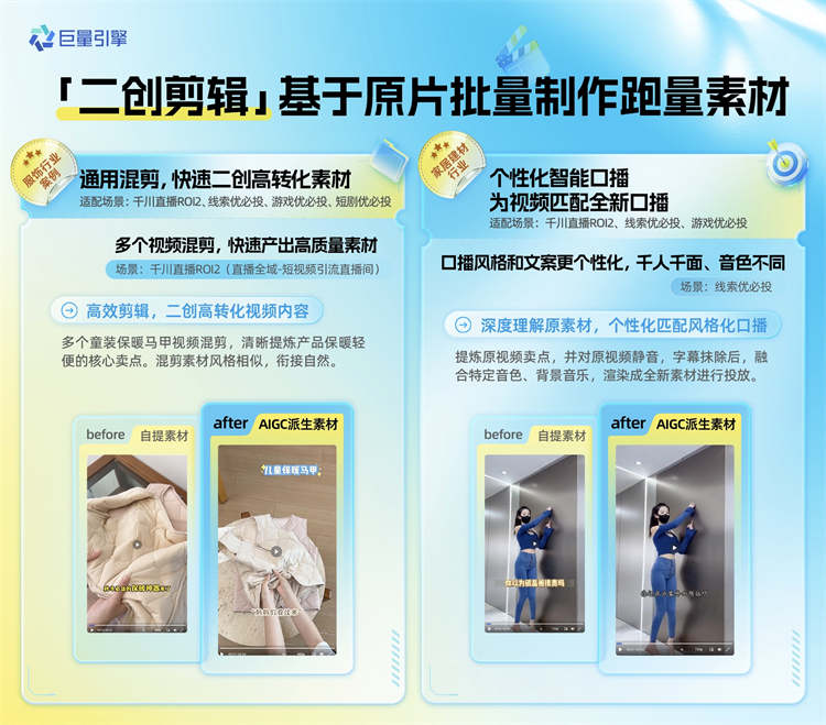 想要延續(xù)爆款素材的跑量潛力,如何批量二創(chuàng)?「通用混剪」通過AI智能分析歷史優(yōu)質(zhì)素材,自動(dòng)拆解分析爆款視頻的畫面、節(jié)奏等元素,智能調(diào)整變速、轉(zhuǎn)場(chǎng)等視頻結(jié)構(gòu),從而快速產(chǎn)出符合跑量預(yù)期的視頻。「?jìng)€(gè)性化智能口播」深度分析商品信息,結(jié)合目標(biāo)用戶的年齡、興趣等,重新生成個(gè)性化的口播腳本,并配合原有畫面,智能生成新素材,提升素材轉(zhuǎn)化效率。