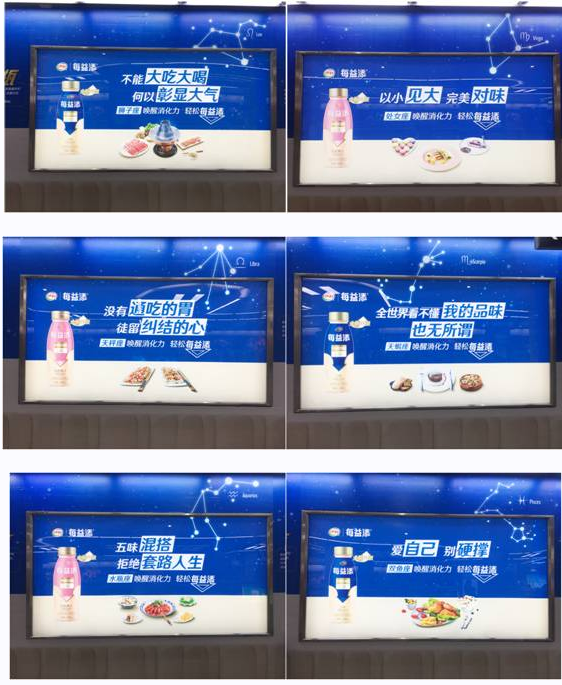 ??結(jié)合消費(fèi)者飲食生活洞察以及時(shí)尚流行的星座文化,伊利每益添在廣州進(jìn)行了地鐵廣告投放,打造的每益添十二星座消化力語(yǔ)錄“中國(guó)最長(zhǎng)餐桌”創(chuàng)意地鐵營(yíng)銷(xiāo)事件,將星座營(yíng)銷(xiāo)玩兒出了新花樣!
