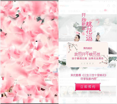 優(yōu)酷“桃花套裝”pop-layer粉紅上線,千萬(wàn)人預(yù)約開(kāi)年桃花。25日零點(diǎn),優(yōu)酷移動(dòng)端首頁(yè)桃花pop-layer正式上線。pop-layer技術(shù)是基于app端的交互特效效果,是一種效果更為炫酷的H5。“開(kāi)年桃花”利用pop-layer技術(shù)優(yōu)勢(shì),以桃花滿滿的互動(dòng)玩法,滿足用戶“看玩”的獵奇心理,給用戶帶來(lái)差異化的觀看體驗(yàn)。網(wǎng)友們通過(guò)預(yù)約新年桃花簽,同時(shí)進(jìn)行訂閱抽獎(jiǎng),共同參與到優(yōu)酷《三生三世十里桃花》的互動(dòng)中來(lái)。桃花符、桃花簽一時(shí)間紛紛來(lái)襲,吸睛能力爆棚有木有~~
