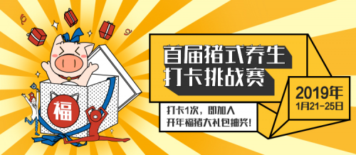 2019月1月21,#豬式養(yǎng)生打卡挑戰(zhàn)賽#在調(diào)養(yǎng)家APP站內(nèi)趣味登場(chǎng),從年輕人日常飲食、起居、運(yùn)動(dòng)、情志四個(gè)維度規(guī)劃挑戰(zhàn)內(nèi)容,打造了乖豬起居、優(yōu)豬飲食、小豬漫步、豬子語(yǔ)錄四大挑戰(zhàn)賽,用戶只需完成以上其中一項(xiàng)挑戰(zhàn),就有機(jī)會(huì)獲得2019開(kāi)年大禮包,成為幸運(yùn)福豬,與2018年流行的“錦鯉”異曲同工。