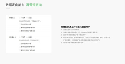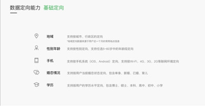 梳理朋友圈廣告的發(fā)展過程可以發(fā)現(xiàn),微信官方總的思路是通過掌握大量的多維度數(shù)據(jù)確保“有價值的相關(guān)性”。在目前的互聯(lián)網(wǎng)巨頭中,社交屬性明顯的騰訊擁有最強的賬號體系,這一定程度上使得數(shù)據(jù)分析變得更加智能、有效。據(jù)悉,目前騰訊生態(tài)下的產(chǎn)品能夠提供包括基礎(chǔ)、興趣、LBS、再營銷等多維度的定向能力,來實現(xiàn)目標消費者的多維度精準觸達。