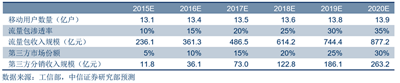據(jù)中信證券研究部根據(jù)流量增長動(dòng)力分析測算規(guī)模趨勢,結(jié)合政策環(huán)境判斷流量單價(jià)持續(xù)下行的空間,測算得到2015/16/17年流量總體收入規(guī)模分別為3324/4786/6126億元,并對流量經(jīng)營的幾種主要經(jīng)營模式分別測算了市場空間,合計(jì)測算2015/16/17年達(dá)19/80/184億元,2015~2020年收入CAGR107%。