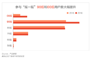 與去年相比,2016年參與微信“搖一搖”的90后和00后用戶數(shù)猛增,其中00后用戶數(shù)接近去年兩倍,紅包狂熱族后繼有人,這股代表中國未來消費風潮的新生力量正在迅速成長。