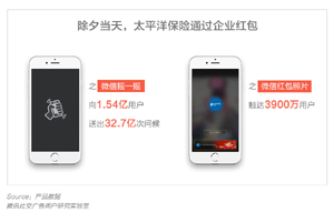 根據(jù)報告數(shù)據(jù),僅在除夕當天,太平洋保險通過微信“搖一搖”向1.54億用戶送出了32.7億次新年問候,同時借力刷屏朋友圈的“紅包照片”觸達3900萬用戶,效果明顯優(yōu)于傳統(tǒng)營銷方式。