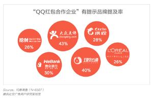 調(diào)查發(fā)現(xiàn),以QQ紅包為例,活動后合作企業(yè)的有提示品牌提及率甚至可高達40%以上,如大眾點評的品牌提及率為43%,理財通的品牌提及率為40%,可見,搭載紅包的品牌從受眾指間進入了受眾腦海。