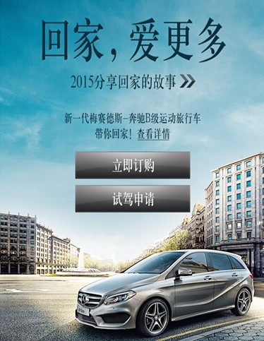 2015年剛剛到來,屢次開啟電商售車之舉的奔馳在營銷上再次創(chuàng)新,于1月21日-1月31日限量提供100輛梅賽德斯-奔馳B級運動旅行車在微信平臺預售,并與電商京東聯(lián)合推動線上銷售。此次奔馳重磅出擊,直擊微信6億用戶,在深度挖掘微信支付便捷性的基礎上,打通線上到線下的購車全過程,再創(chuàng)行業(yè)全新記錄,成為2015首個移動營銷。