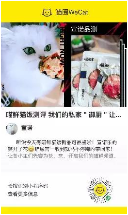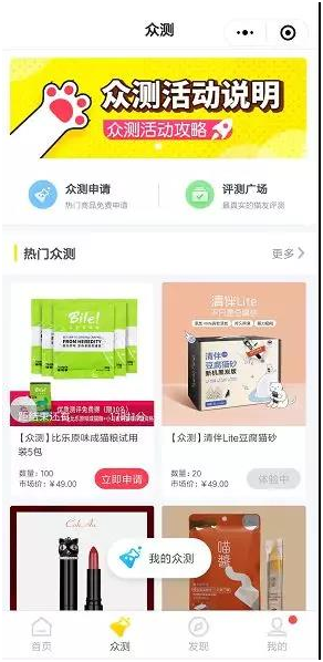 因此,在常規(guī)的官方測(cè)評(píng)之外,“貓來了”另辟蹊徑,引入了小程序“貓圈WeCat”的眾測(cè)功能,邀請(qǐng)大量貓奴粉絲參與免費(fèi)試用,讓自家貓咪嘗嘗鮮。而后根據(jù)粉絲的反饋形成系列眾測(cè)報(bào)告,既提升了品牌產(chǎn)品的知名度,也進(jìn)一步打開了潛在的市場。