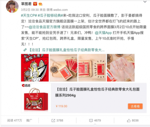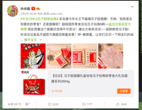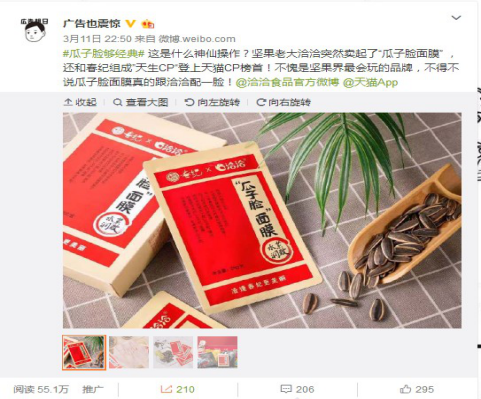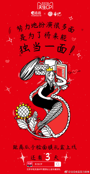 ??聯(lián)合泛90后的食材養(yǎng)膚品牌春紀(jì)組成天生愛(ài)美CP跨界推出“瓜子臉面膜”,“瓜子臉,夠經(jīng)典”的口號(hào),更是戳到年輕人輕松變美的心聲。洽洽更是貼心推出洽洽x天貓3.8女王節(jié)限定款“零食+面膜”的大禮盒,誓必要把“女王們”寵壞的節(jié)奏。