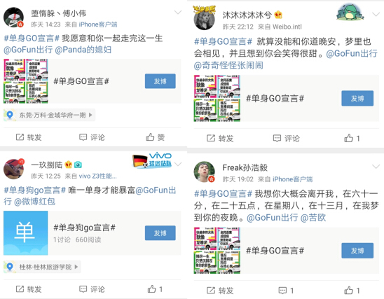 據(jù)了解,在本次營銷活動中,GoFun出行聯(lián)合了首汽租車、首汽約車、貓眼演出、墨跡天氣、ZAKER、蘇寧易購、閃送、酒仙網(wǎng)、花椒直播、全民K歌、朝陽大悅城等10多個大品牌,共同組成“單身GO關愛協(xié)會”,在為用戶助力的同時,也形成多方品牌合力,共同借勢推動微博互動話題量持續(xù)上漲。