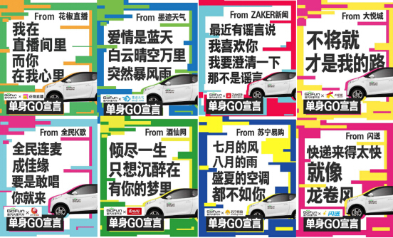 與此同時,這些聯(lián)合品牌還結(jié)合自身品牌特點,與GoFun出行共同推出聯(lián)合文案。“七月的風,八月的雨,盛夏的空調(diào),都不如你”,“最近有謠言說,我喜歡你,我要澄清一下,那不是謠言”……蘇寧易購、ZAKER新聞等品牌與GoFun出行共同“發(fā)聲”的內(nèi)容中,既貫徹了優(yōu)質(zhì)內(nèi)容產(chǎn)出這一營銷理念,也體現(xiàn)了品牌商對于活動的高度認可。這些品牌的強強聯(lián)手,也為打造共享出行IP營銷貢獻了新的思路。
