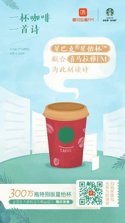 舉個簡單例子,比起刷手機,你很難漏掉音頻節(jié)目中廣告,特別當不是會員的時候,這是余建軍口中的“獨占性”。多項實驗也表明,同等條件下,人類對于聽覺記憶往往優(yōu)視覺記憶。據(jù)艾媒數(shù)據(jù)顯示,喜馬拉雅平臺的用戶還普遍具有“三高”特征(即高學歷、高收入、高活躍)。去年8月,喜馬拉雅首次與星巴克跨界推出了300萬杯“為此刻讀詩”的限量版星怡杯,正是一次用戶人群匹配的營銷合作,讓音頻廣告不再是打擾而是打動。