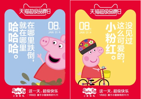 2019年1月8日,《小豬佩奇》牽手天貓超級(jí)品牌日再度亮相,讓更多的中國(guó)觀眾了解到,可以放心的在官方渠道購(gòu)買自己喜愛的《小豬佩奇》IP周邊產(chǎn)品,同時(shí)天貓超級(jí)品牌日當(dāng)天還放出了諸多優(yōu)惠福利。