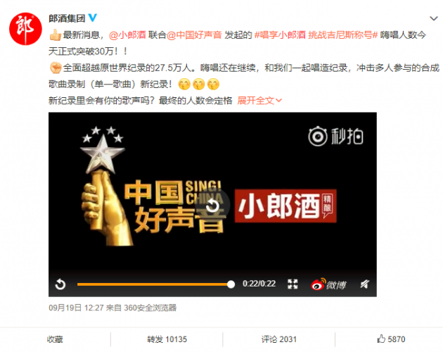特約《中國(guó)好聲音》和“唱享小郎酒·挑戰(zhàn)吉尼斯世界紀(jì)錄?稱(chēng)號(hào)”活動(dòng)的完美收官,讓“喝小酒 小郎酒 全國(guó)熱銷(xiāo)的小瓶白酒”迅速傳遍全國(guó)。期間,小郎酒不僅與《中國(guó)好聲音》、唱吧APP深度合作,還在微博、微信、今日頭條、貼吧、知乎等平臺(tái)進(jìn)行了廣泛地傳播。