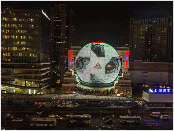 為了創(chuàng)造震撼的視覺效果,此次阿迪達斯將上海最具標志性的美羅城球形建筑打造成一顆超巨型世界杯官方比賽用球。巨大LED球型大屏循環(huán)播放23位創(chuàng)造者的人像,全天候向世界輻射創(chuàng)造能量,每一位路過的行人都感受到世界杯的激情和運動的純粹。對于球迷來說,阿迪達斯的這場營銷活動既創(chuàng)造了一個可以隨時隨地和球星互動的機會,還提供了身臨其境、虛實相生的游戲體驗。通過AR新科技,為忙碌的生活帶來輕松的調(diào)劑,用最前沿、最富創(chuàng)造力的方式與世界杯一起狂歡。