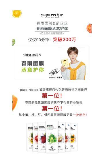 5月19日上午10時,春雨面膜正式開啟了其年度新品春雨果蔬面膜的網(wǎng)上銷售,數(shù)據(jù)顯示,僅僅開售后90分鐘,該款面膜的銷售額便已突破了200萬,根據(jù)春雨面膜官方蓋章確認(rèn),當(dāng)天papa recipe海外旗艦店位列天貓熱銷店鋪排行第一位,春雨新品果蔬面膜銷售奪下當(dāng)日行業(yè)銷售第一位,其中黃、橙、紅、綠四款果蔬面膜更是一搶而空,范丞丞的帶貨能力由此可見一斑。