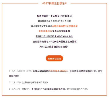 壹點(diǎn)壹客“527示愛(ài)”,通過(guò)前期網(wǎng)上征集,選擇最能打動(dòng)人心的2位粉絲告白蜜語(yǔ),制作成蜜語(yǔ)廣告牌,于深圳全城2000個(gè)電梯上線發(fā)布,上演一場(chǎng)全城浪漫,轟轟烈烈的實(shí)力寵妻故事。創(chuàng)意形式新穎、大膽,在情感溝通上更具共鳴。也因此吸引了眾多人的關(guān)注和主動(dòng)傳播,成為粉絲心中“最會(huì)告白”、“最會(huì)撩人”品牌。