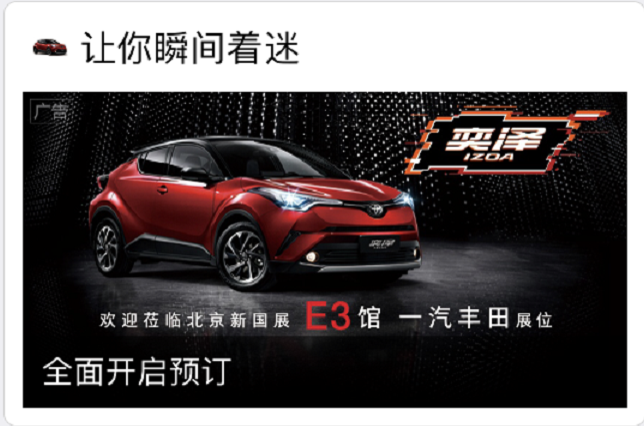 在找到合適的溝通手段之后,活動(dòng)環(huán)節(jié)設(shè)計(jì)也是營銷的關(guān)鍵一步。用戶只要點(diǎn)擊品牌廣告,就可了解一汽豐田奕澤IZOA的詳細(xì)信息。