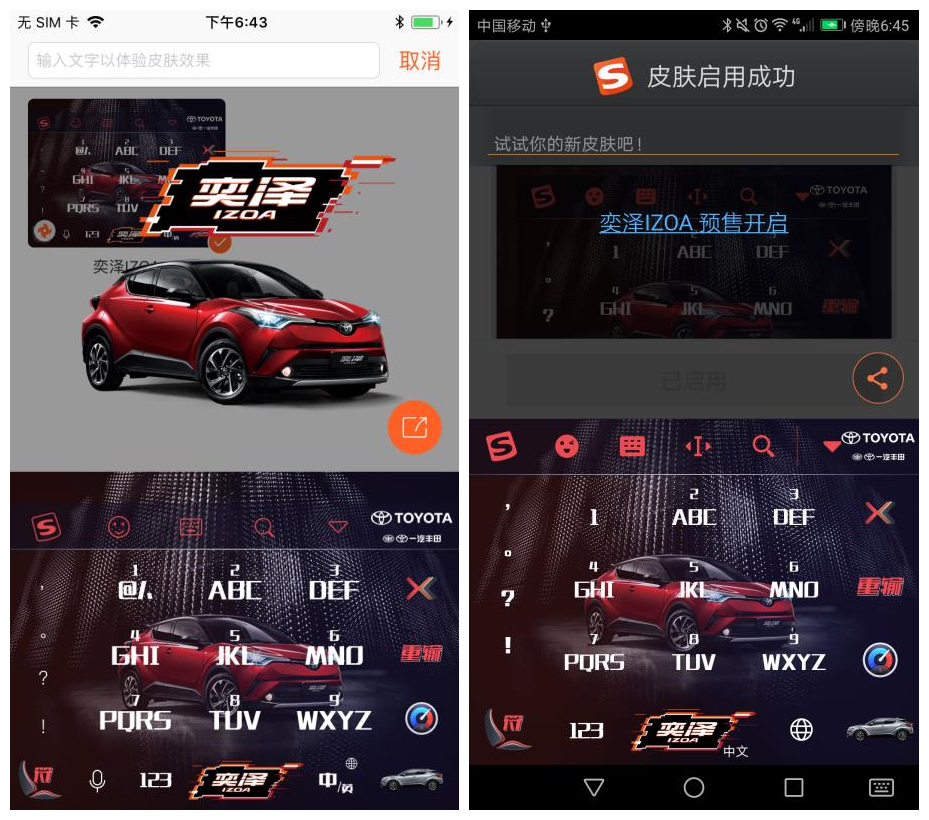 此外,作為最受年輕人歡迎的輸入法,搜狗還為一汽豐田奕澤IZOA打造了專屬的輸入法皮膚和專有表情,與一汽豐田奕澤IZOA“時(shí)尚”、“酷炫”的特質(zhì)進(jìn)行呼應(yīng),受到年輕人追捧。