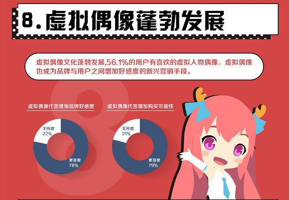 除此之外,二次元用戶大多有追捧的虛擬偶像,而且近80%的二次元用戶表示,如果他們喜歡的虛擬偶像代言了某個品牌,將會大大增加他們對品牌的喜愛度和購買意愿。在品牌年輕化轉(zhuǎn)型迫在眉睫的前提下,如何通過營銷拿下二次元用戶成為眾矢之的。