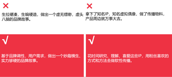 三次元的品牌如何才能玩轉(zhuǎn)二次元營銷?網(wǎng)易漫畫市場總監(jiān)羅茜丹和網(wǎng)易Lofter市場總監(jiān)唐娟認為必須做好3點:第一,必須要找到合適的故事。如果品牌本身故事性強,那就量身定做專屬IP故事;如果品牌本身故事性弱,那就找到一個和自己品牌調(diào)性匹配的IP故事合作;第二,必須要找到合適的嫁接點,不管是內(nèi)容植入,人物代言,還是聯(lián)合知名動漫IP開發(fā)周邊,都需要找到合適的嫁接點;第三,把硬的做軟,把軟的做硬。所謂把硬的做軟,指得是在傳播上要軟,即使品牌和知名動漫IP達成了合作,也要耐心去研究這些IP,研究他們的粉絲,用粉絲喜歡的方式方法去做傳播;所謂把軟的做硬,指得是品牌故事必須言之有物,不能太過虛無縹緲,塑造的IP故事實力要足夠硬,這樣才不會流于形式,浮于表面。