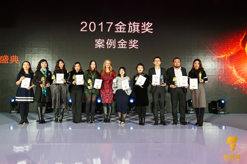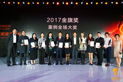 好爸爸品牌事業(yè)部總經(jīng)理胡珊女士(左5)代表品牌領(lǐng)取2017金旗獎案例全場大獎