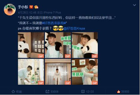 4月25日,當(dāng)紅小生于小彤通過(guò)微博發(fā)布了一組親膚抱動(dòng)圖,并@好爸爸官方微博。暖萌的畫(huà)風(fēng),立刻引來(lái)了粉絲圍觀,轉(zhuǎn)發(fā)、評(píng)論、點(diǎn)贊的數(shù)量很快突破了8萬(wàn)。#好爸爸親膚抱#也隨即成為熱議話(huà)題。隨后,高端親膚洗滌品牌好爸爸隔空回應(yīng),為于小彤點(diǎn)贊的同時(shí),邀請(qǐng)粉絲們制作發(fā)布親膚抱表情包。