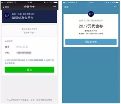 用戶點(diǎn)擊朋友圈廣告獲得代金券時(shí),可一鍵領(lǐng)取GAP的微信會(huì)員卡。微信會(huì)員卡領(lǐng)取后會(huì)放在微信卡包中,不僅不用擔(dān)心忘記帶會(huì)員卡,或資料丟失,而且會(huì)員卡的積分變動(dòng)可在微信上隨時(shí)隨地查看。