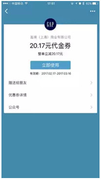 2017年春節(jié)過后,GAP在微信朋友圈投放了一次廣告。用戶點(diǎn)擊廣告即可領(lǐng)取GAP的代金券。這些2017元到20.17元不等的代金券可以吸引用戶到線下使用和消費(fèi)。