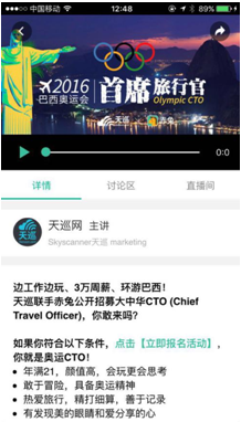 而天巡的合作伙伴赤兔,則是領(lǐng)英(LinkedIn)專(zhuān)為中國(guó)用戶(hù)打造的實(shí)名職場(chǎng)社交App,主要幫助中國(guó)職場(chǎng)人士在職業(yè)場(chǎng)景下發(fā)現(xiàn)群組活動(dòng)、拓展經(jīng)營(yíng)人脈、實(shí)現(xiàn)職場(chǎng)O2O。 “天巡巴西首席旅行官”的職位招募在赤兔上一經(jīng)發(fā)布當(dāng)即吸引了超過(guò)10,000名來(lái)自不同行業(yè),不同領(lǐng)域的旅行達(dá)人報(bào)名,其中不乏一些旅行KOL的參與報(bào)名。