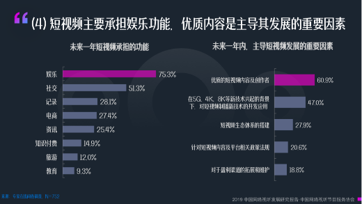 ??與此同時,短視頻主要承擔的是娛樂功能,且優(yōu)質(zhì)原生內(nèi)容及創(chuàng)作者是主導其發(fā)展的重要因素。據(jù)報告顯示,未來一年短視頻承擔的功能中,“娛樂”占最大頭,高達75.3%;其次是“社交”和“記錄”,分別占據(jù)51.3%和28.1%。可見短視頻潛在的消費市場需求依舊很旺盛。