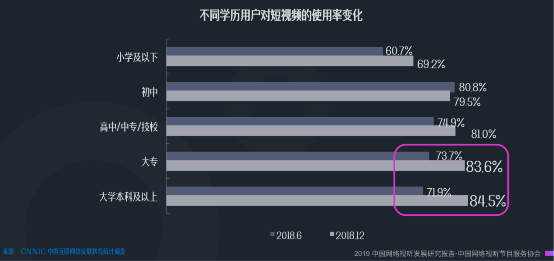 ??對短視頻平臺用戶的偏見,該做出一些改變了。報告顯示,2018年大專學歷人群在短視頻使用率上增長了9.9%,大學本科以上學歷人群增長了12.6%。