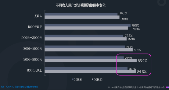 ??月入5-8千和月入8千以上人群的短視頻使用率,在18年下半年分別上漲至85%左右。隨著較高收入用戶群體更多地參與視聽消費,“愿掏腰包”這種人群特征則更加顯現(xiàn),用戶的消費興趣挖掘?qū)诩夹g(shù)實現(xiàn)上更加精準。
