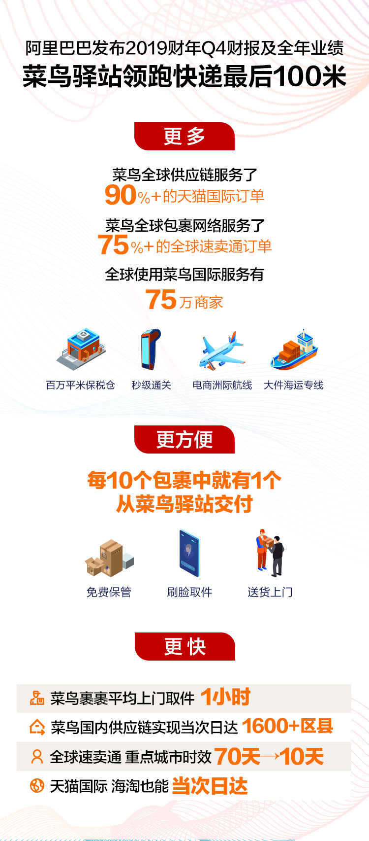 財(cái)報(bào)顯示,菜鳥在末端和國(guó)際物流上進(jìn)展神速:截至2019年3月,菜鳥驛站日均服務(wù)包裹量占阿里巴巴中國(guó)零售平臺(tái)的10%以上,也就是說(shuō),每10個(gè)包裹中就有1個(gè)通過(guò)菜鳥驛站送達(dá)消費(fèi)者。菜鳥還服務(wù)了超過(guò)75%的全球速賣通訂單和超過(guò)90%的天貓國(guó)際訂單,全球物流網(wǎng)絡(luò)持續(xù)領(lǐng)先。