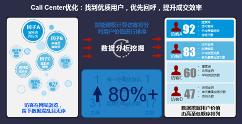 轉(zhuǎn)化率是衡量一個平臺優(yōu)質(zhì)與否的最直接的指標(biāo),因此對平臺用戶轉(zhuǎn)化的優(yōu)化成為整個UEO的重中之重。一方面,我們需要對用戶轉(zhuǎn)化的整個流程進(jìn)行優(yōu)化。針對線上就可成交的平臺,我們首先需要運(yùn)用“路徑轉(zhuǎn)化漏斗圖”識別和分析每一步的流失,發(fā)現(xiàn)泄漏點(diǎn),并通過多維度自由剖析,分析泄露原因,查缺補(bǔ)漏,更好促成線上交易。而針對線上線下結(jié)合成交的平臺,則要利用高關(guān)注度區(qū)域引導(dǎo)用戶進(jìn)行留資,并通過建立品牌知識庫提高溝通滿意度,找到優(yōu)質(zhì)用戶優(yōu)化Call Center,提升線下成交效率。國雙助力某汽車客戶建立訪客分級模型,優(yōu)先回呼優(yōu)質(zhì)用戶,從而將成交效率提升了80%。