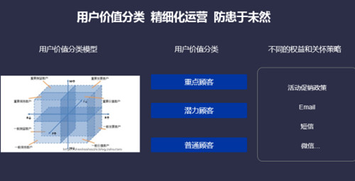 根據(jù)多維度行為特征,對用戶進(jìn)行流失分析,并根據(jù)預(yù)測模型采取相應(yīng)的干預(yù)手段,及時與用戶溝通,開展豐富的營銷活動,對品牌與產(chǎn)品的用戶進(jìn)行維系。同時,根據(jù)用戶價值進(jìn)行分類,對重點(diǎn)客戶、潛力客戶和普通客戶采取有針對性的維系策略,通過精細(xì)化運(yùn)營防患于未然。