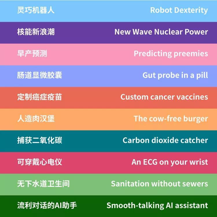 圖 | 2019 年《麻省理工科技評(píng)論》全球十大突破性技術(shù)榜單包括:靈巧機(jī)器人、核能新浪潮、早產(chǎn)預(yù)測(cè)、腸道顯微膠囊、定制癌癥疫苗、人造肉漢堡、捕獲二氧化碳、可穿戴心電儀、無(wú)下水道衛(wèi)生間、流利對(duì)話的AI助手共 10 大突破性技術(shù)。