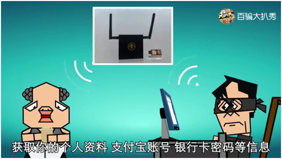 再好比說可以偽裝出一個免費的WIFI信號,連上以后,你的瀏覽記錄就會被監(jiān)聽,訪問網(wǎng)頁時候的站點也可以隨時被修改替換。騙子就會引導(dǎo)你點擊等釣魚網(wǎng)站,獲取個人資料、支付寶賬號、銀行卡密碼等信息。