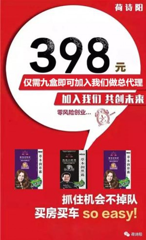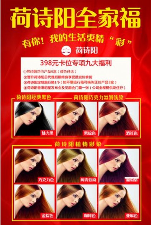 只要你參加398元荷詩陽植物染發(fā)活動,并提交個人資料向公司申請授權,就可以加盟荷詩陽,成為荷詩陽的金牌代理商。