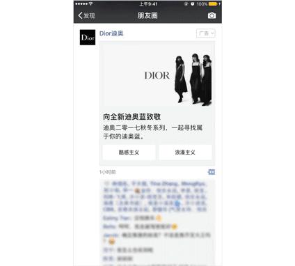 9月16日,一條國(guó)際知名化妝品品牌Dior的廣告出現(xiàn)在很多用戶的朋友圈,與以往不同的是廣告底部出現(xiàn)了“酷感主義”和“浪漫主義”兩種選擇按鈕,用戶根據(jù)自己的喜好進(jìn)入不同創(chuàng)意的落地頁(yè),標(biāo)志著微信朋友圈已更新到第七種產(chǎn)品形態(tài)——選擇式卡片廣告。