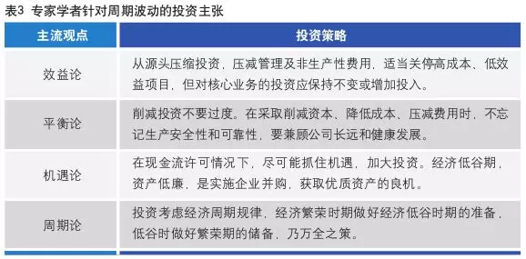每次經(jīng)濟(jì)波動,一些專家和學(xué)者都會發(fā)表諸多文章和報告,從不同側(cè)面、不同角度,闡述并提出應(yīng)對經(jīng)濟(jì)波動的投資策略和主張。其中,針對企業(yè)的投資策略,主要聚焦在生存與發(fā)展上,概括起來大致分為四類主流觀點(diǎn)(見表3)。