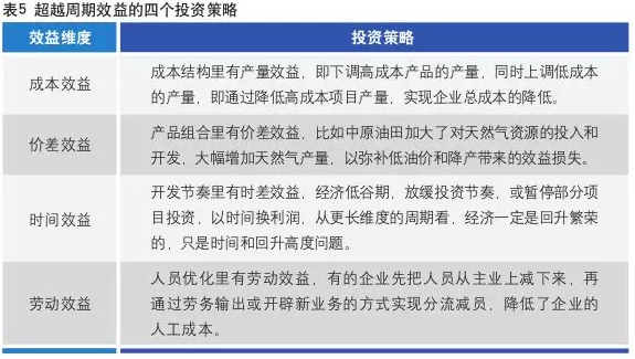 我國企業(yè),尤其國有企業(yè),應(yīng)對經(jīng)濟(jì)周期波動的投資策略基本相同,采取的最重要舉措是收縮投資,具體措施概括為六個方面(見表2)。其中,企業(yè)的關(guān)注點(diǎn)普遍集中在調(diào)產(chǎn)量、降成本和保效益三方面,效益投資理念成為核心理念,主導(dǎo)了各項投資策略的制定、實(shí)施。
