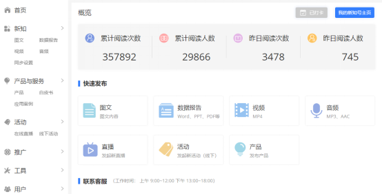 市場(chǎng)推廣運(yùn)營(yíng)體系提供內(nèi)容運(yùn)營(yíng)、直播運(yùn)營(yíng)、活動(dòng)運(yùn)營(yíng)、SMS短信運(yùn)營(yíng)等多種運(yùn)營(yíng)方式。文章、直播與活動(dòng)將會(huì)免費(fèi)實(shí)時(shí)分發(fā)至商業(yè)新知平臺(tái),優(yōu)質(zhì)文章經(jīng)審核后收錄至新知庫(kù),依托知識(shí)圖譜的精準(zhǔn)分發(fā)實(shí)現(xiàn)持續(xù)的營(yíng)銷(xiāo)效果。
