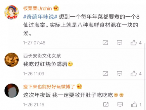 這次的#奇葩年味說#,不僅從多渠道發(fā)力,同時(shí)也與京東到家、百威啤酒、綠盒王老吉、好時(shí)巧克力、海天招牌拌飯醬、泰森等品牌藍(lán)V聯(lián)動(dòng)造勢,將內(nèi)容傳播效果Max! 截至目前,該話題引起了網(wǎng)友的廣泛熱議,一大波有趣的評(píng)論接踵而來......