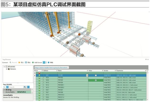 (3)虛擬控制技術(shù)則通過(guò)對(duì)控制系統(tǒng)進(jìn)行模擬調(diào)試,調(diào)試成功后生成PLC代碼,直接傳輸至現(xiàn)場(chǎng)待調(diào)試設(shè)備上的PLC,將調(diào)試時(shí)間大大縮短,圖5為某項(xiàng)目虛擬仿真PLC調(diào)試界面截圖。